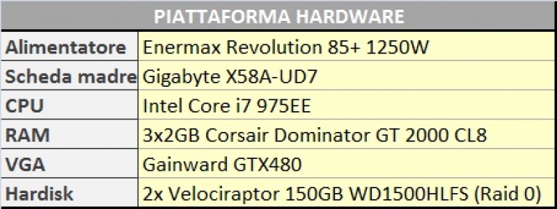 Al fine di uniformare e rendere quanto più attendibili i risultati, i test sono stati condotti con una temperatura ambientale di 21° C. La CPU, un i7 975EE, è stata portata a una frequenza di overclock di 4205 Mhz con 1,4V di vcore, per un consumo lineare sotto carico di circa 250 Watt. Per raggiungere questo carico è stato sollecitato anche il controller della memoria integrato nel processore. Le RAM usate per il test, delle Corsair Dominator GT 2000, sono state impostate a una frequenza di 1740 con timings CL7-7-7-20 1T.