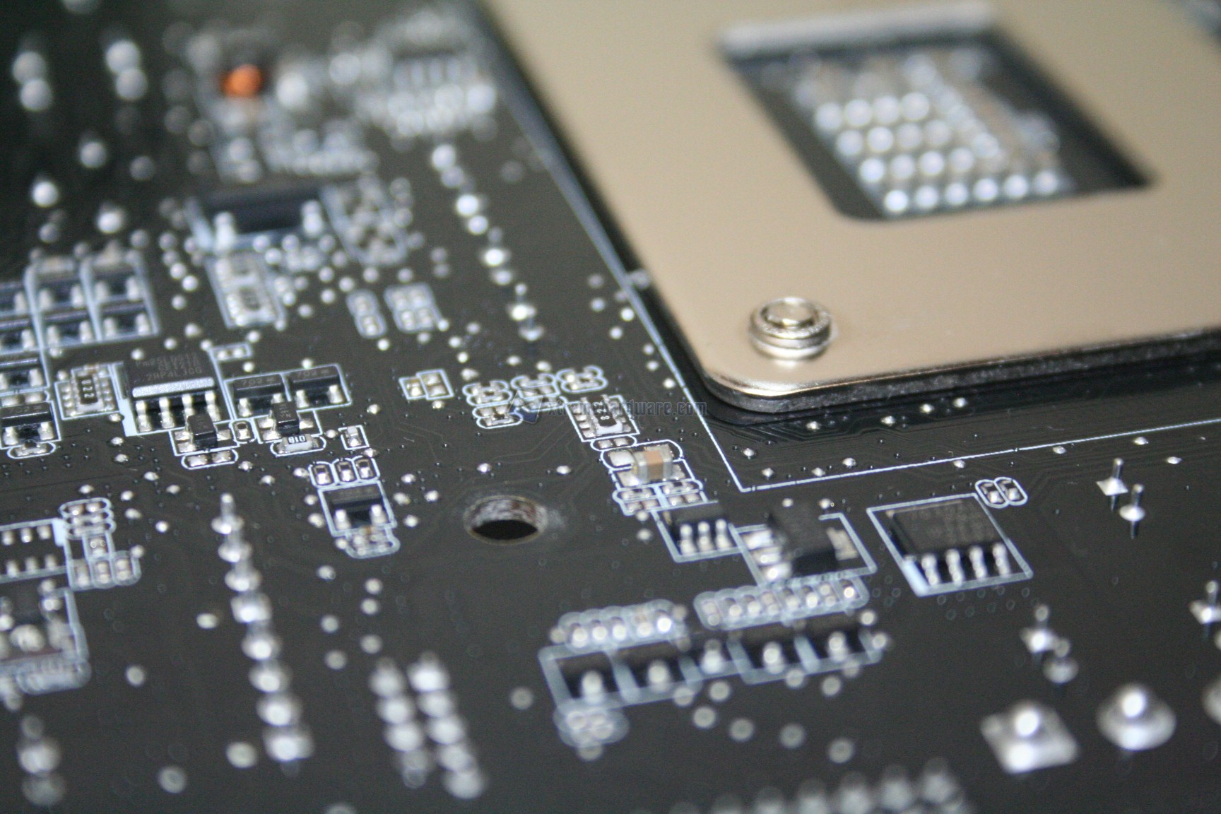 Andata, le temperature sono perfette. Cos’è quella vite? Signori, la quarta vite della scheda madre. Con il dissipatore installato, non è possibile montarla. Da notare la ventola inferiore, che collide con il PCB verticale ed i condensatori.