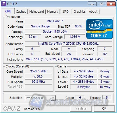 Di seguito potete vedere una schermata effettuata con il software di monitoring CPU-Z che ci mostra tutti i parametri della cpu Intel i7-2700K: