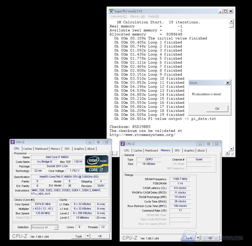 Avvalendoci di un sistema di raffreddamento estremo, con azoto liquido, siamo riusciti ovviamente a salire maggiormente in frequenza, riuscendo a chiudere i benchmark SuperPI 1M a 5375 MHz e wPrime 32M a 5250MHz. Benché le prestazioni possano risultare comunque elevate, ci saremmo aspettati di più dalla CPU con processo litografico da 22nm. La richiesta di tensione è davvero molto alta e, nonostante il freddo gelido apportato sulla CPU, il dissipatore delle fasi di alimentazione della scheda madre non presentava ghiaccio, mantenendo il circuito a temperatura tiepida.
