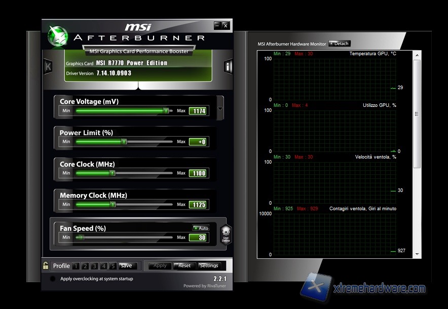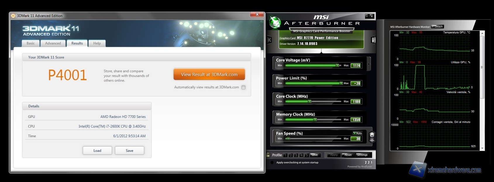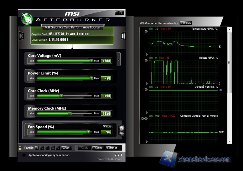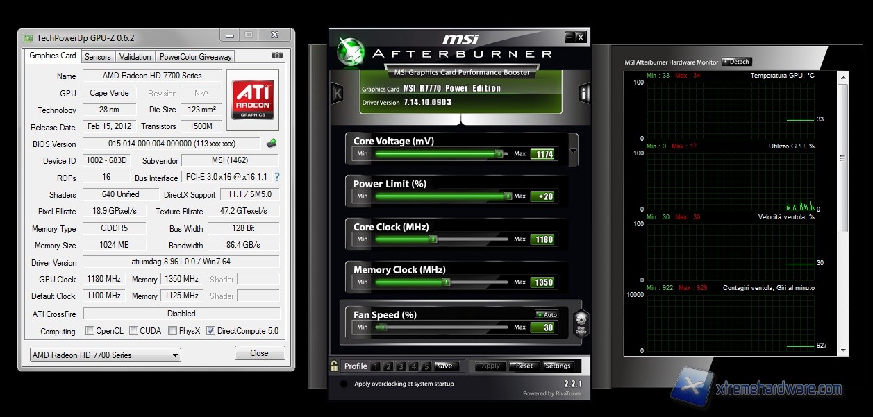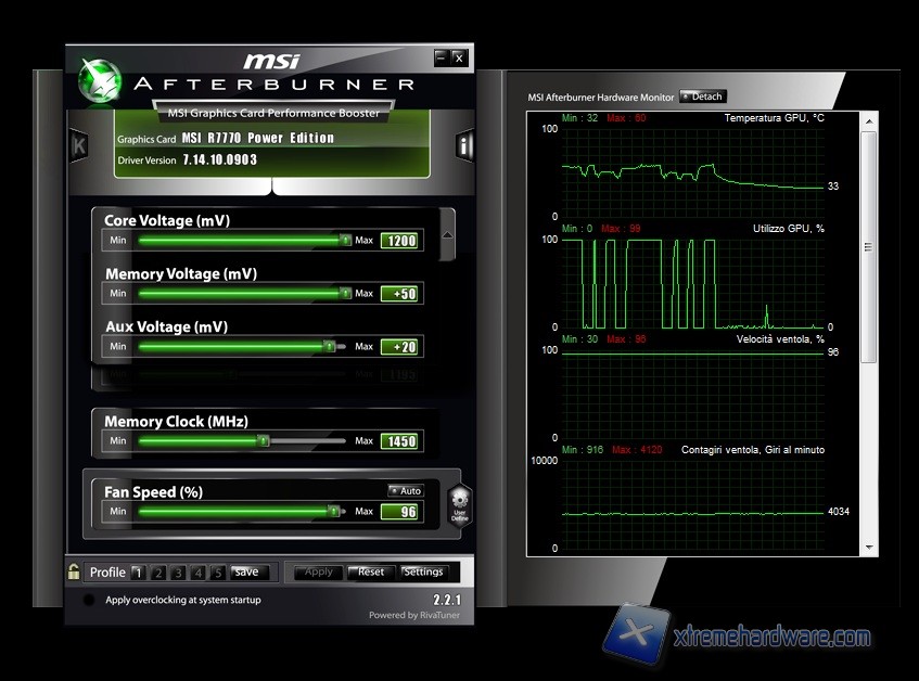 Utilizzando il noto tool software MSI AfterBurner, abbiamo eseguito varie prove sulla R7770 Power Edition. La prima è stata la ricerca della massima frequenza stabile per GPU e memorie non intervenendo con l'overvolt, mentre nella seconda prova abbiamo impostato voltaggi e frequenze adeguate per trovare la massima frequenza stabile utilizzando il raffreddamento ad aria stock della scheda ma in configurazione Dual Fan, che ha la migliore resa per quanto riguarda le temperature d'esercizio.