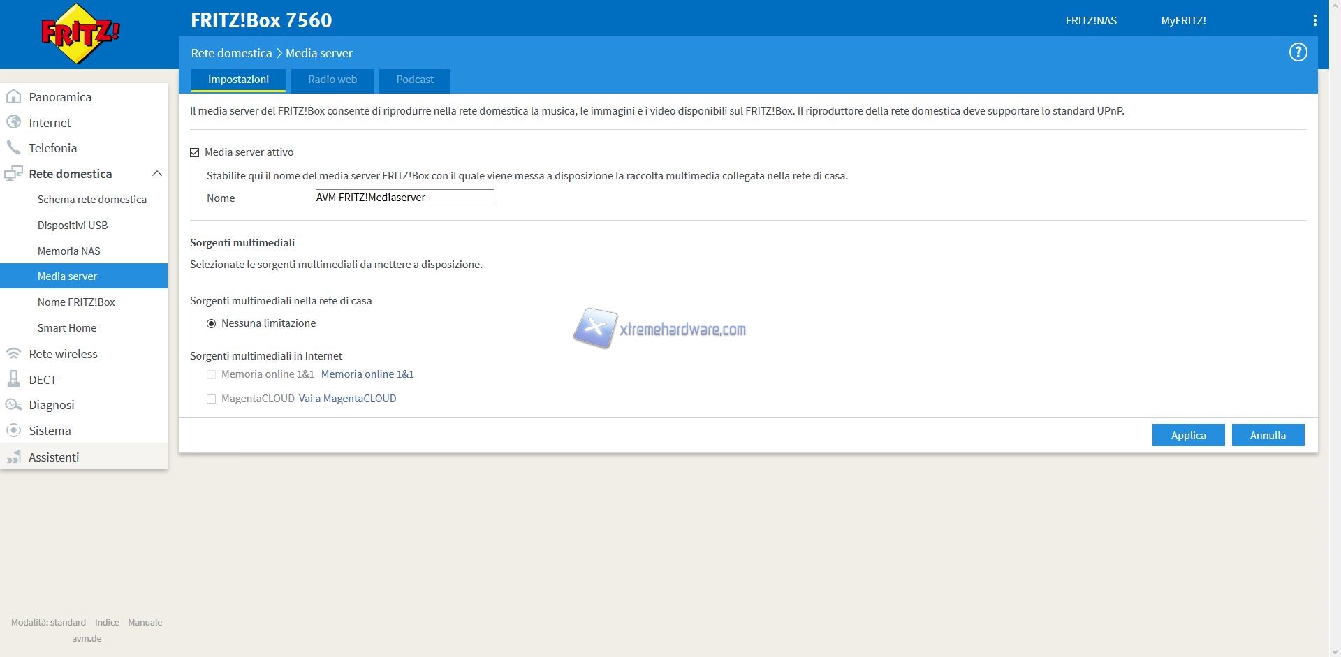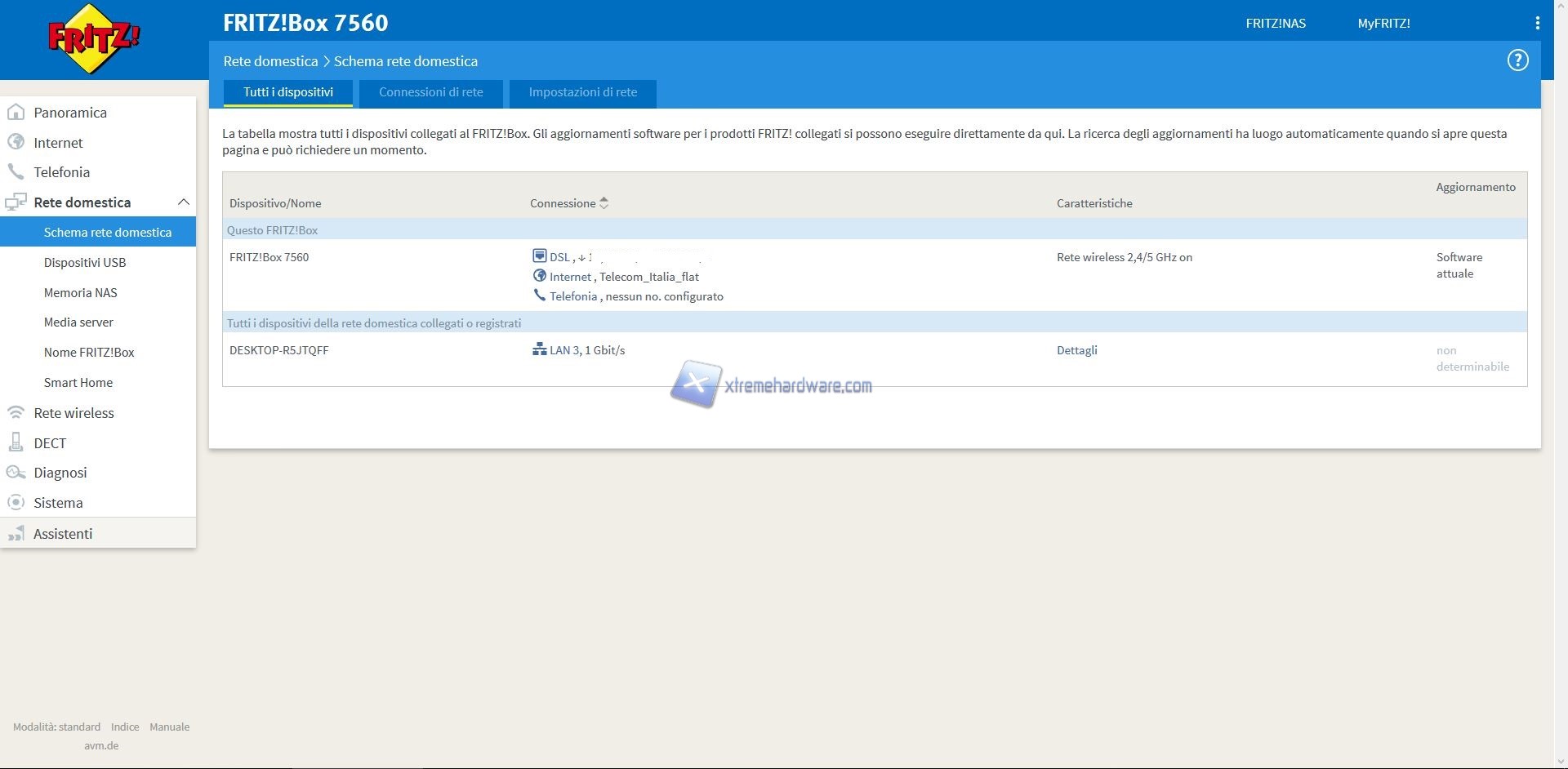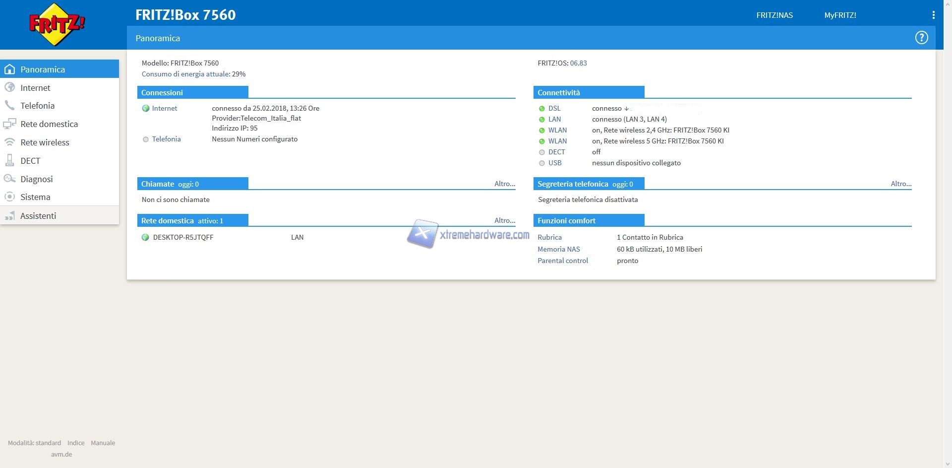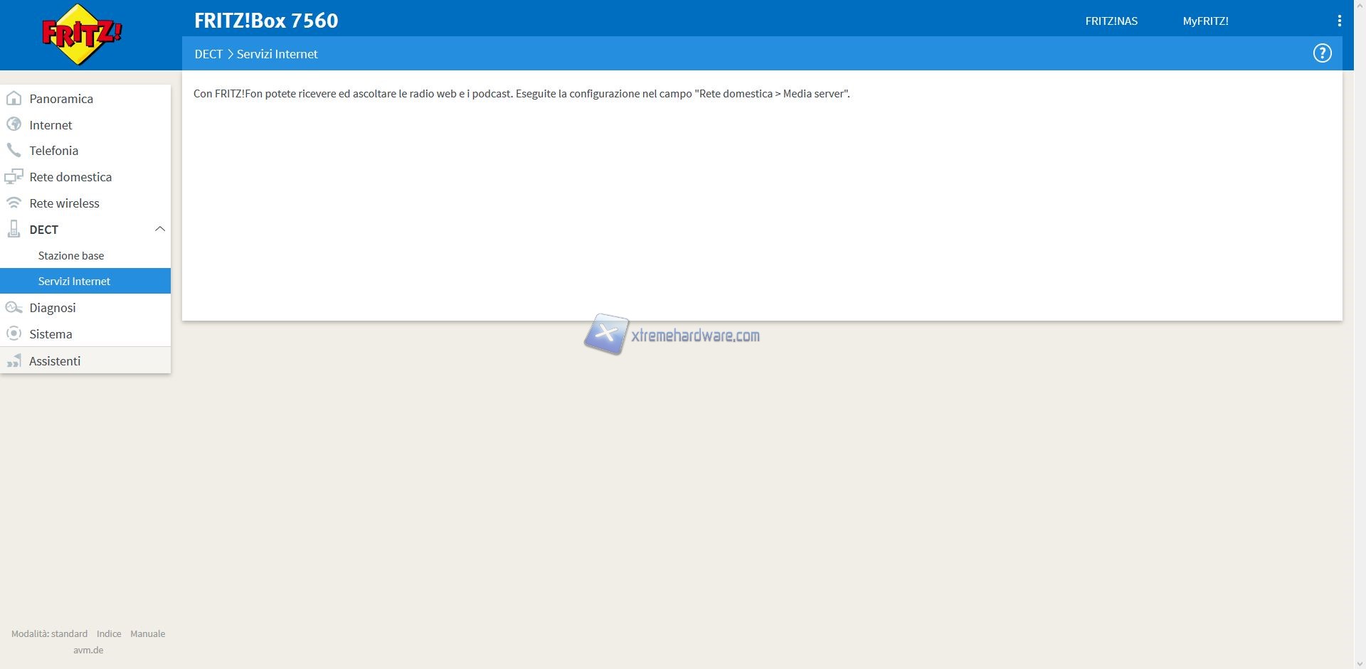Oltre a questo Menù troveremo altri quali ‘’Internet’’, ‘’Telefonia’’, ‘’Rete Domestica’’, ‘’Rete Wireless’’, ‘’DECT’’, ‘’Diagnosi’’, ‘’Sistema’’ e ‘’Assistenti’’.
