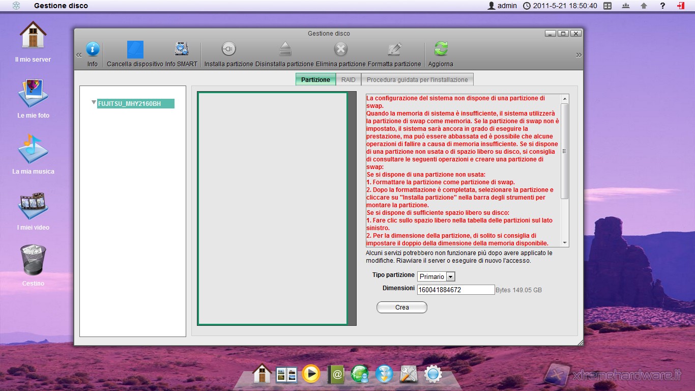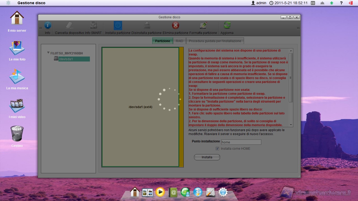 Una volta inseriti i dati, la prima operazione è l'inizializzazione del disco. Supponendo di avere un disco vergine, occorrerà prima formattarlo e poi installare la partizione. Notare che è possibile visionare anche lo stato smart dell'unità.